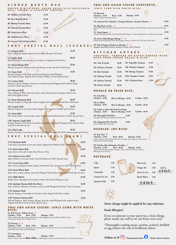 At Tomo Asian Cuisine, located at 7698 Dorchester Blvd, Hanover, MD, culinary traditions from Thailand and Japan converge in a delightful Asian fusion experience. The menu offers a vibrant array of selections, from the crispy Vegetable Tempura to the fragrant Panang Curry, each dish crafted using fresh, high-quality ingredients. Sushi lovers will relish the expertly prepared rolls, such as the Crazy Tuna Roll and Salmon Lover Roll, which boast exquisite flavors and stunning presentations.